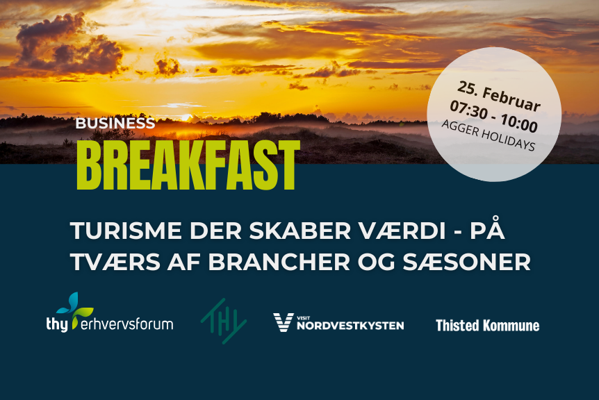 Vi inviterer til årets første Business Breakfast, hvor vi sætter fokus på turismens betydning for Thy – både i et erhvervs-, bosætnings- og økonomisk perspektiv. Turismen spiller nemlig en central rolle for udviklingen af vores kommune. Den skaber arbejdspladser, tiltrækker nye borgere, styrker detailhandlen og bidrager til et levende lokalsamfund – året rundt.